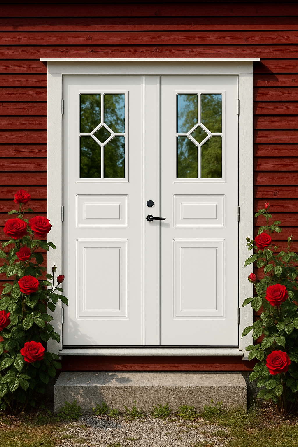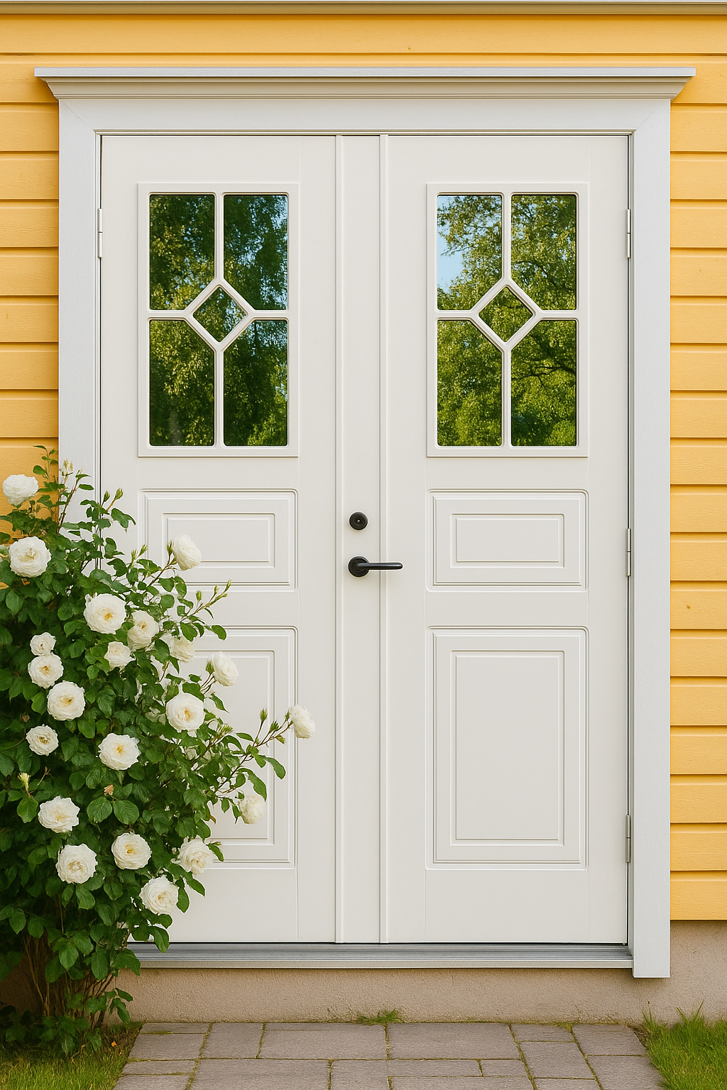 Entrédörren är en av husets viktigaste detaljer. Med Emådörren Romben får du en pardörr som kombinerar traditionell design, eleganta glaspartier och hög kvalitet. Resultatet är en ytterdörr som förhöjer husets karaktär och skapar en välkomnande entré i många år framöver.