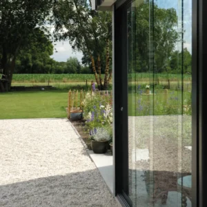 Skjutdörrarna tillverkas med ett ramfritt glassystem där fokus ligger på fri sikt, ljusinsläpp och ett modernt uttryck. Glasdörrarna saknar vertikala profiler mellan panelerna, vilket skapar en nästan helt obruten panoramavy mot omgivningen. När dörrarna är stängda får du ett effektivt skydd mot väder och vind – när de öppnas skjuts glasen smidigt åt sidan och suddar ut gränsen mellan inne och ute.