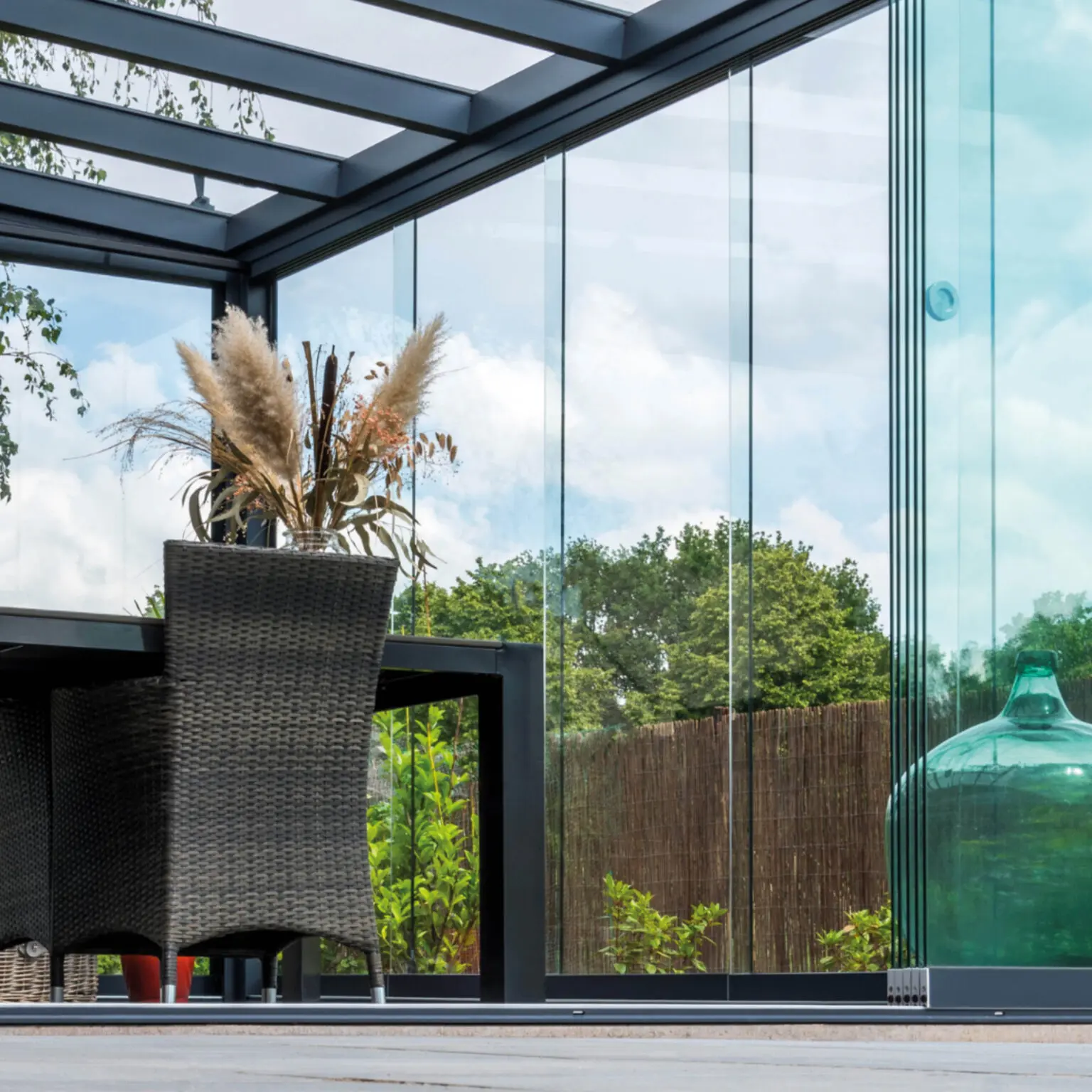 Glaset fungerar som ett diskret klimatskydd som gör att du kan stanna ute längre – utan att förlora känslan av att vara utomhus. Med ramfria glasdörrar får du: