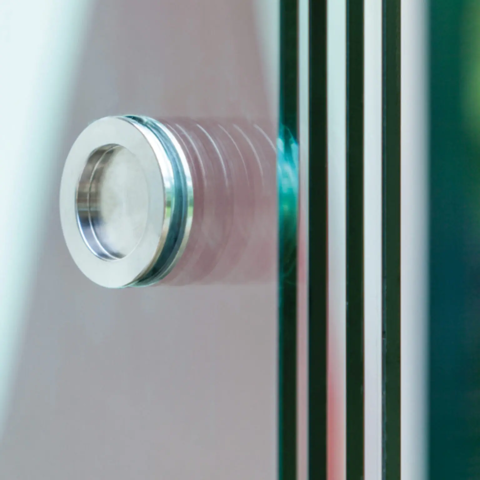 Dörrarna tillverkas ramfria för bästa möjliga utsikt utan störande profiler. Glaset är 10 mm härdat säkerhetsglas. Skjutdörrarna tillverkas med höjden 2100 mm.