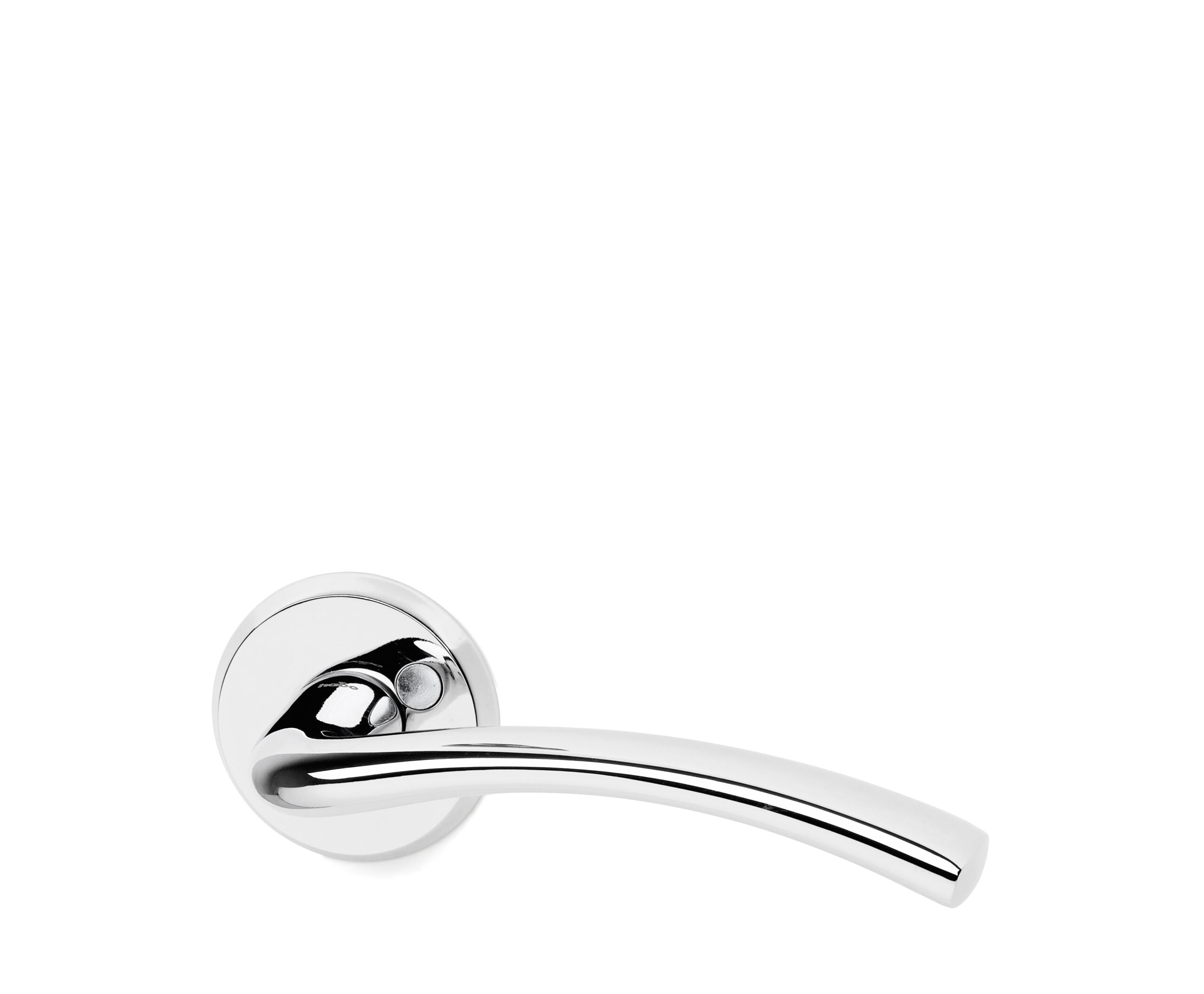 Dörrhandtag av mässing med dubbelverkande returfjäder för ytterdörr med modullåshus. För dörrtjocklek 38-80 mm. Utsprång 60 mm.